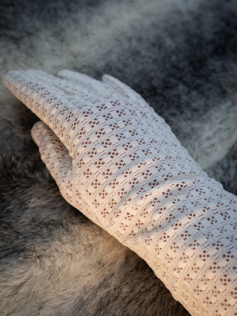 Ivory crochet gloves with an openwork lattice pattern and scalloped edge at the wrist. Mid-length design with a delicate, airy texture, offering both elegance and lightness. Estimated to date back to the 1960s, a refined example of mid-century styling.
